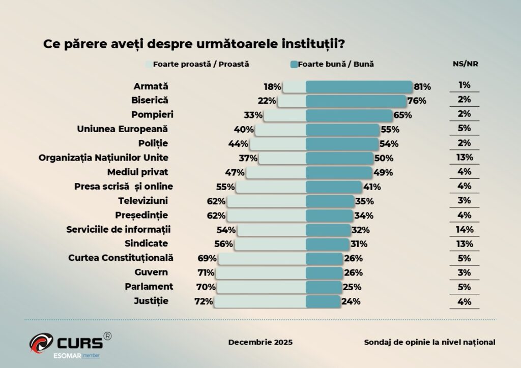 • Armata beneficiază de încrederea a 81% dintre respondenți, urmată de biserică - 76% și pompieri - 65%.
