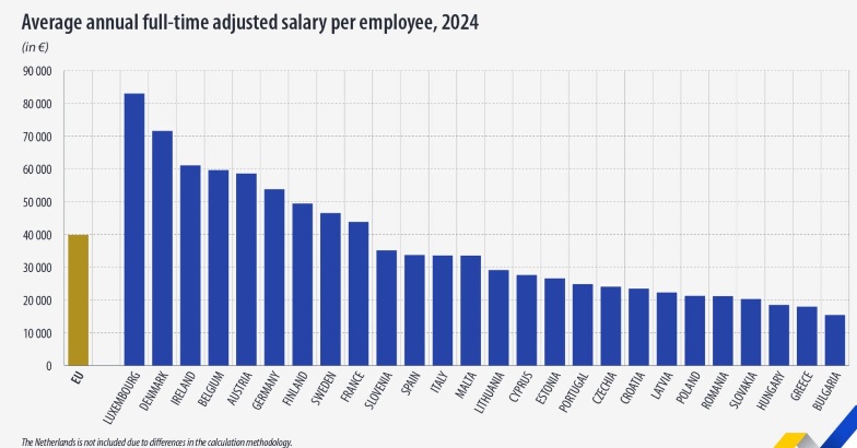 Eurostat arată că salariul mediu anual în 2024 din România, de 21.108 euro, se situează pe locul 5, în ordinea inversă a clasamentului, depășind Slovacia (1690 euro/lună), Ungaria (1.541 euro/lună), Grecia (1.500 euro/lună) și Bulgaria (1.283 euro/lună).