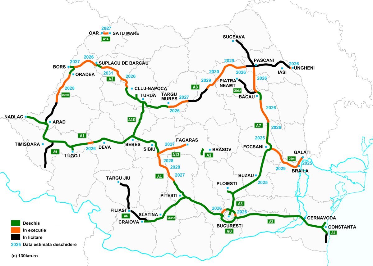 • În total, România dispune în prezent de 1.416 kilometri de autostrăzi și drumuri expres, din care 146 de km au fost dați în folosință în cursul anului 2025.