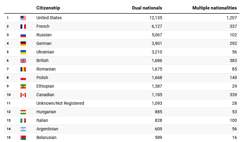 Este important de menționat că unii militari sunt numărați de mai multe ori, deoarece dețin mai mult de două cetățenii.
